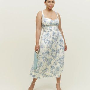 Reformation's Brixton dress is fitted in the bodice and waist with a full skirt. This dress features a smocked back bodice and cross back straps. It gives you some shape without being too snug. Size: 10 Worn once. This is a lightweight drapey crepe fabric - 53% viscose, 47% rayon. - Center back zipper - Cross back straps - Not bra friendly - Relaxed fitting skirt - Slim fitting bodice - Smocked back bodice - Sweetheart neckline - Unlined