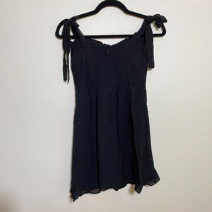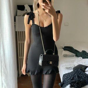 How dreamy. The Christine is slim fitting throughout the bodice, waist, and skirt. This mini length dress has a sweetheart neckline and a ruffle edged hem. It has adjustable tie straps so you can wear it at whatever length you prefer.