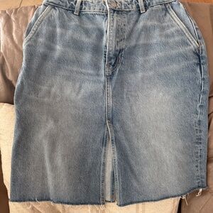 Excellent condition, raw hem. Hits just below my knees (I am 5’3).