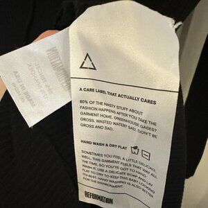 NOTE: I had my tailor sew a hole that was near my knee, and have included photos of the stitch; it's just shy of three inches long, but you'll notice in the photo of the dress on my bed that it gets kind of lost in the dark, textured fabric. The interior label that says "A care label that actually cares" is also detaching.