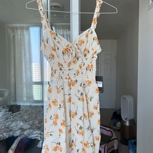 Reformation Elyse Dress in Limonada Ivory White Yellow Floral Print Ruffle Tie Front Smocked Dress