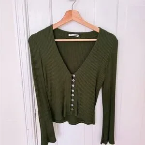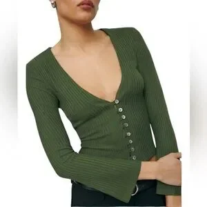 Reformation Gellar Knit Cropped Top has Plunge V-Neck with Long Slightly Flared Sleeve Button Down Front with Shell Buttons Made of Tencel Ribbed Knit Stretch Cotton.