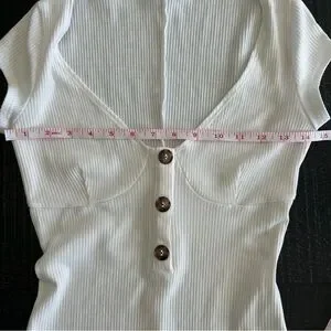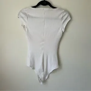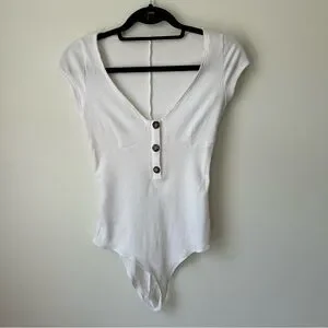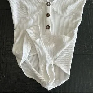 Stylish ivory bodysuit with ribbed texture and faux button details. Perfect for layering with a cardigan or on its own.
