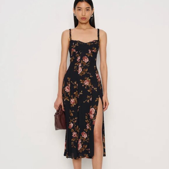 Romance for one. Shop the Katara Dress from Reformation, a sleeveless midi-length dress with a sweetheart neckline, ruffling at the straps, and a side slit.