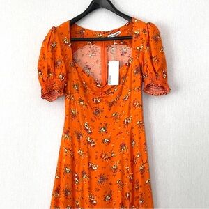 Delicate florals add a sweet touch to this charming midi by Reformation featuring puff sleeves and a thigh-grazing slit.