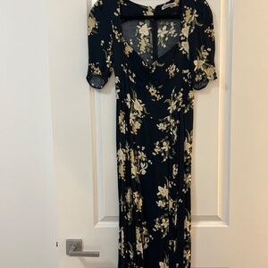 Midi dress with fitted bodice and relaxed fit skirt. 53% viscose, 47% rayon.