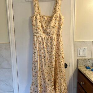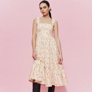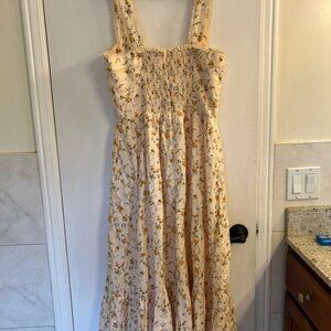 Back smocking, non-adjustable straps, straight neckline. And ruffled hem. This is a lightweight linen fabric - 100% linen