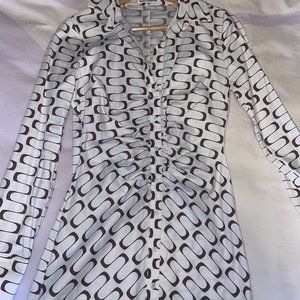 This mini-length shirt dress is so adorable! It features ruching along the front of the dress with a sleek button-down for a more elegant look which still gives you shape. This dress never failed to get compliments. Is the perfect look for a bougie dinner with friends or an early cocktail hour.