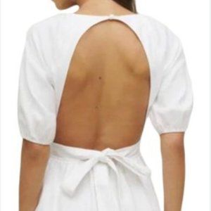 Elegant white backless dress. Features short sleeves and a fitted waist. Perfect for any occasion.
