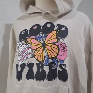 Refuge | Tan pullover good vibes butterfly graphic hoodie.