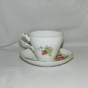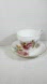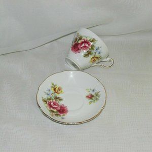 Vintage teacup. White with pink and yellow roses, blue blowers. Scalloped rim with gold trim. Made in England.