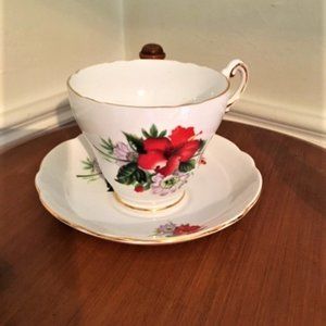 Selling 2 beautiful, vintage Regency English Bone China Tea Cup & Saucer with gold trim in excellent condition! This set features a pattern with lovely red hibiscus