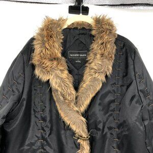 This beautiful insulated jacket has faux fur trim along the front opening up to and around the neckline. Inner snap button closure with stylistic hook and bar closure on the outside. Stylistic stitching gives this a trapper's/eskimo look. Two hip pockets.