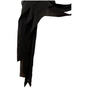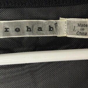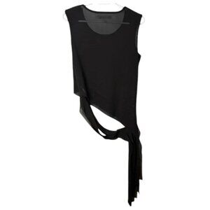 A black asymmetrical sleeveless top from the brand Rehab. The top features silver-toned skull embellishments on the front and has a distinctive, flowing asymmetrical hem with a layered ruffle tie detail on one side. The style is often described as chic, edgy, or having a grunge aesthetic.