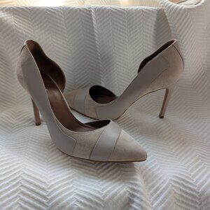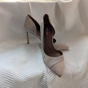 Stunning Reiss "Augusta" D'Orsay pumps crafted in luxurious suede and smooth leather. The elegant pointed toe and high stiletto heel create a sophisticated silhouette. A timeless addition to any wardrobe, perfect for special occasions or adding a touch of class to your look. The neutral color and classic pointed toe make them incredibly versatile for a range of outfits and occasions.