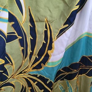 Print: Tropical foliage motif in fresh green, white, teal, and navy tones—evoking a refined island aesthetic.