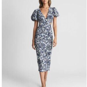 Reiss Jennah Print Printed Puff Sleeve Midi Dress, Navy/White - Size 4