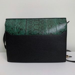 Crafted from textured leather and features a stunning green snake-print top, the suede-lined interior is surprisingly roomy