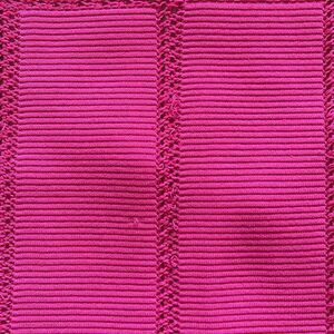 Reiss Dawson Bodycon dress. In a striking pink color. A heavy knit with a neutral tan underlay. Almost crochet details vertically down the front and under the bust. Ribbed knit that is 53% viscose, 46% nylon and 1% elastane. Short sleeve with a squared off neck. Back hidden zipper closure with gold zipper pull. Flat lay measurements: 15” pit to pit, 25” length.