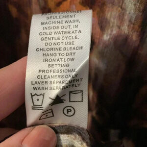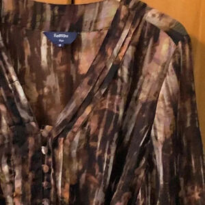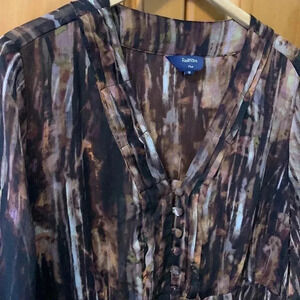 Short sleeves, V neck with buttons. Ties at waist. Colors are black, browns, tans. Abstract pattern. Semi sheer fabric. Size 18.
