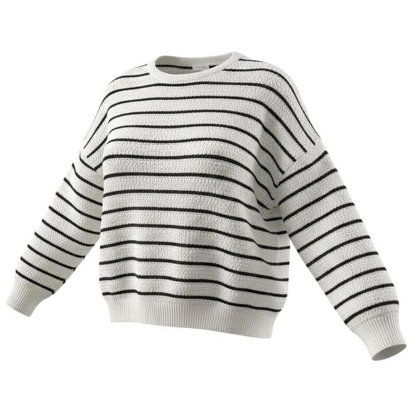 Brand new Reitmans striped knit sweater in a timeless cream and black colourway. Featuring a relaxed, slightly cropped silhouette with soft open-knit texture and classic horizontal stripes.