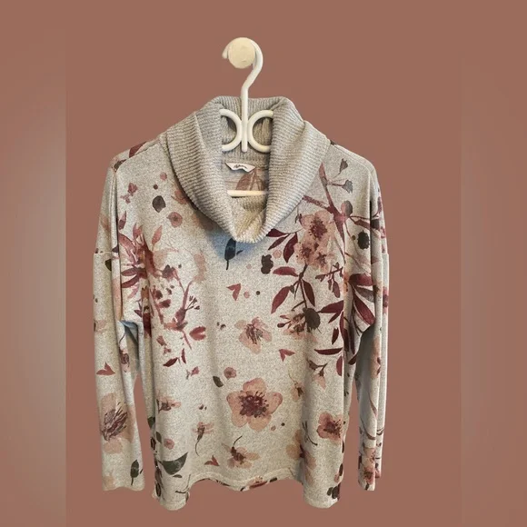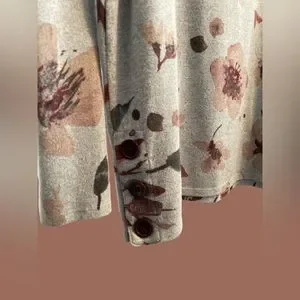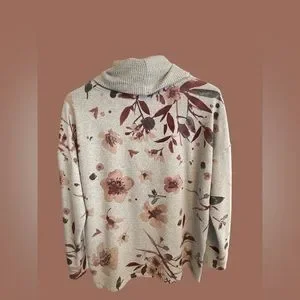Fashion floral turtleneck sweater. Plush like material, soft grey colour, extra button attached to inside tag. 3/4 sleeves, buttons on both sides that cannot be unbuttoned. No pockets or zipper, pullover style. Very stretchy material, gently used, in good condition. Pit to pit measures 22.5”