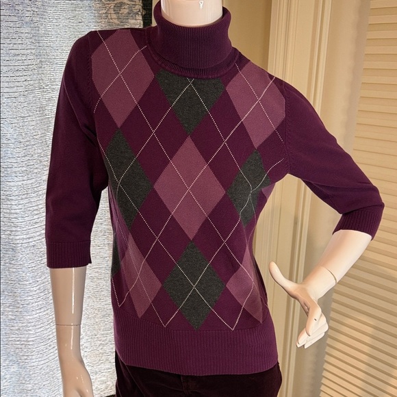 Reitmans Argyle Sweater Cotton Blend Purple Turtleneck 3/4 Sleeves Women’s Sz M