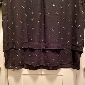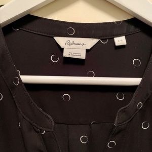 Reitmans black & white 3/4 sleeve button up circle pattern blouse with double layer at the bottom and pocket detail. Excellent condition, machine washable. Size L.