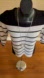 Stylish black and white striped top. Features three-quarter sleeves. Perfect to dress up under a blazer or for casual wear.