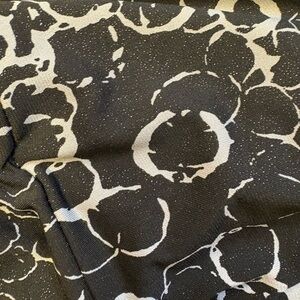 Description: This elegant sheath dress features a striking black and white pattern with an intricate design of curvy, swirling lines. It has a flattering cowl neck and 3/4 sleeves, making it perfect for casual or work occasions. Knee length.