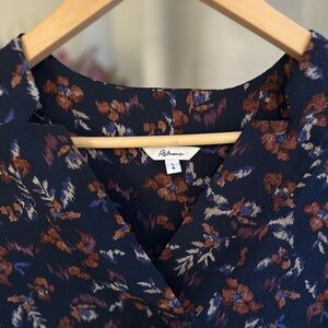 Stylish navy blouse with pattern. Ideal for casual or dressy looks. Elastic bottom. Size large.