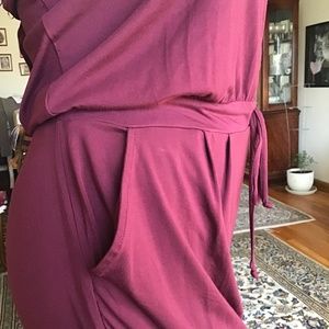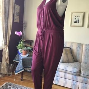 Stylish burgundy jumpsuit by Reitmans. Sleeveless with button front. Includes waist tie for a flattering fit.