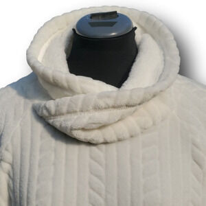 This Reitmans sweater features a luxurious chenille fabric with a cabled pattern and a split cowl neck, perfect for stylish comfort in cooler weather.
