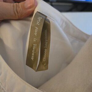 Lovely Reitmans "Choose Happiness" V-neck tunic blouse in Excellent Used Condition (EUC). This essential white top features a flattering V-neck henley placket with three buttons, decorative chest pockets, and subtle smocking/gathering at the shoulders. The lightweight knit (97% Polyester, 3% Spandex) provides a comfortable, slightly stretchy fit. Perfect for a minimalist work look, a casual day out, or a stylish travel outfit!