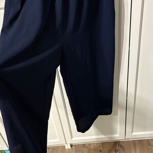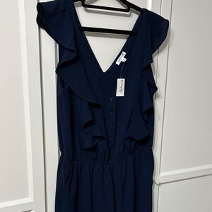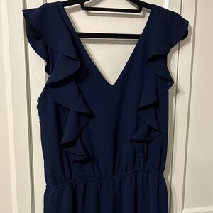 Chic dark blue jumpsuit with stylish ruffles. Sleeveless and versatile.