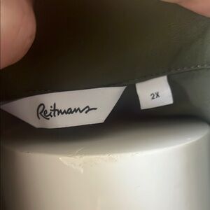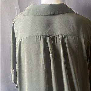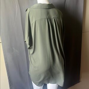 This relaxed and boxy green blouse from Reitmans features a notched collar and short cuffed sleeves, offering a casual yet polished look. The lightweight fabric drapes beautifully, making it perfect for both work and casual outings. Size 2X, 75 cm pit to pit,95 cm length