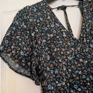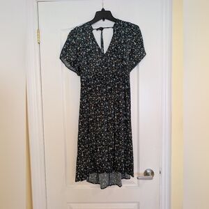 Chic high low dress with floral design. Features a flattering V-neck and short sleeves. Ideal for versatile styling.