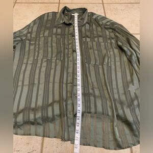 Elevate your wardrobe with this stylish and versatile blouse from Reitmans. This button-down shirt features a subtle striped pattern in varying shades of olive green, giving it a sophisticated and chic look. The silky, lightweight fabric drapes beautifully, making it comfortable to wear all day long. It's a great piece for both professional settings and casual outings. This blouse is a women's size 2X and is in excellent, like-new condition.