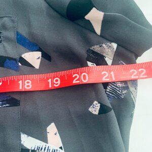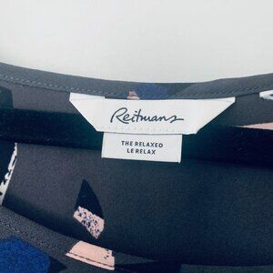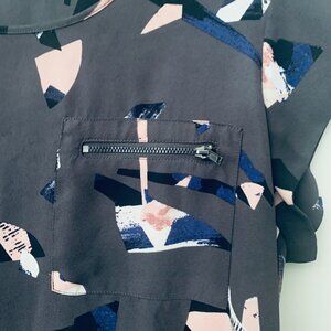 Reitmans Blouse grey with modern pattern. 100% polyester, no stretch. Front zipper pocket. Short Sleeves. No rips, great condition. Great for office, work attire, casual lunch outfit. Look great with jeans or skirt.