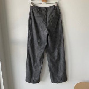 Designed with a high rise, a pleated wide leg, and classic pinstripe pattern. Made from non-stretch woven fabric with a zipper closure with hook and bar, functional slanted pockets at front, and non-functional welt pockets at back.