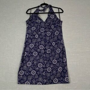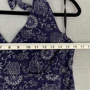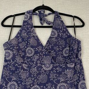 Reitmans Mini Sundress. Women's tag size 13. 100% Cotton. Dark blue paisley. Tied halter neck. Zipper up back.