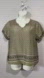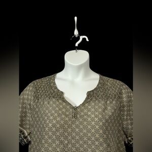 Beautiful Reitmans lightweight blouse, perfect for warm weather. It features a stylish geometric pattern in shades of olive green, black, gray, and white. The V-neckline is slightly split and gathered, adding a unique touch of style. The hem and short sleeves are adorned with a contrasting border. Made from a soft and lightweight blend of 70% cotton and 30% silk, this blouse offers comfort and fluidity. It is a size 18W / New 🏷️ / 🚭