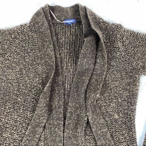 Women's Size Medium. 100% Acrylic. Brown Heather Knit. Open Front Cardigan with wide Neck Tie. Hip Length. Pockets. Neck tie is attached up to point shown in main photo.