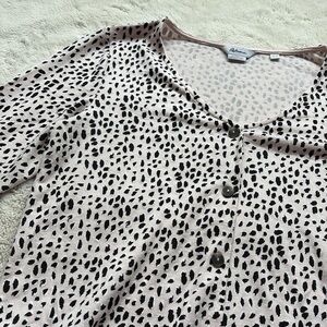Chic and playful, this Reitmans pink animal print blouse is a must-have for casual or workwear looks. Featuring a soft pink base with an abstract spotted pattern, this top includes 3/4 sleeves, a flattering V-neckline, and a stylish tie-front hem for added flair. Lightweight and comfy—perfect for spring and summer outfits.