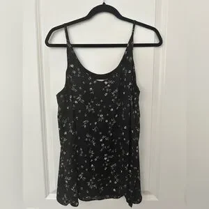 Elegant black camisole with white floral design. Ideal for layering or solo wear. Adds a touch of sophistication.