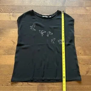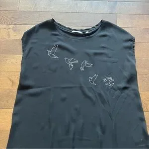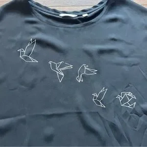 - Black short sleeve shirt with a paper crane design on the front