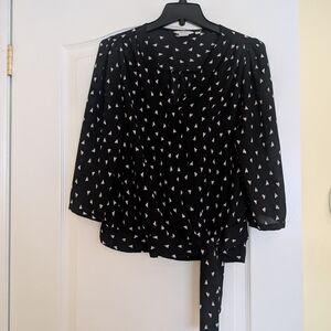 Elegant black blouse with subtle white accents. Features a stylish tie detail.