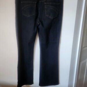 Dark blue stretch denim Reitmans pull on jeans have front and back pockets. Size 15 ladies, inseam 32 inches. Each leg measures approximately 24 inches wide at the crotch, 20 inches at the hem. No tags, but never worn so in excellent condition. Non-smoking home, no pets.