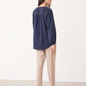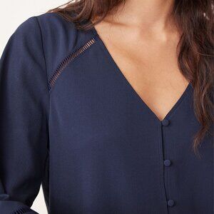 Reitmans Women’s Long Sleeve Blouse. Faux buttons down center, v-neck neck line, cut out details on sleeves and shoulders. Fabric chiffon like, slightly sheer. Navy colour darker in person.