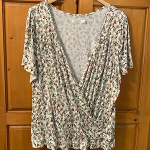 White with pinky red and green floral pattern. Short sleeves. Soft like a tee shirt. Faux wrap style. Stretch. Size 2X.